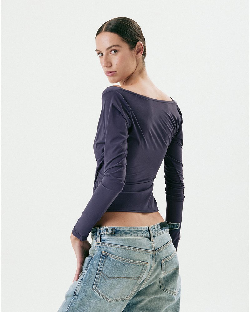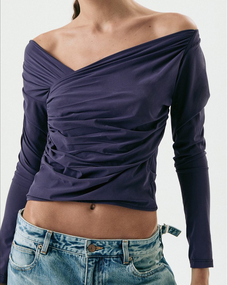 Top manga larga de microfibra traslúcida con detalles de frunce en lateral y escote asimétrico.
